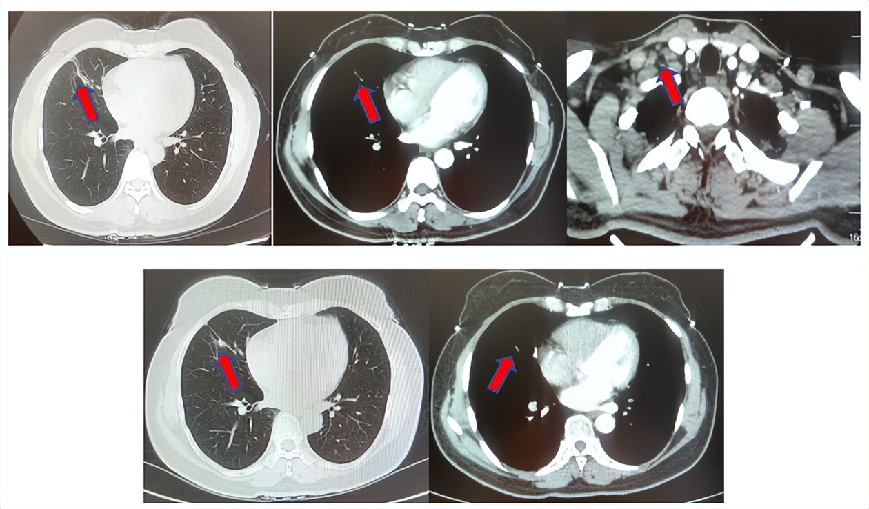 图6:上三图分别展示2019年6月患者达到最佳疗效时肺CT肺窗及纵隔窗右肺中叶病灶及锁骨上淋巴结影像,下两图表示2025年2月患者最近复查评效时肺CT肺窗及纵隔窗肺内病灶影像