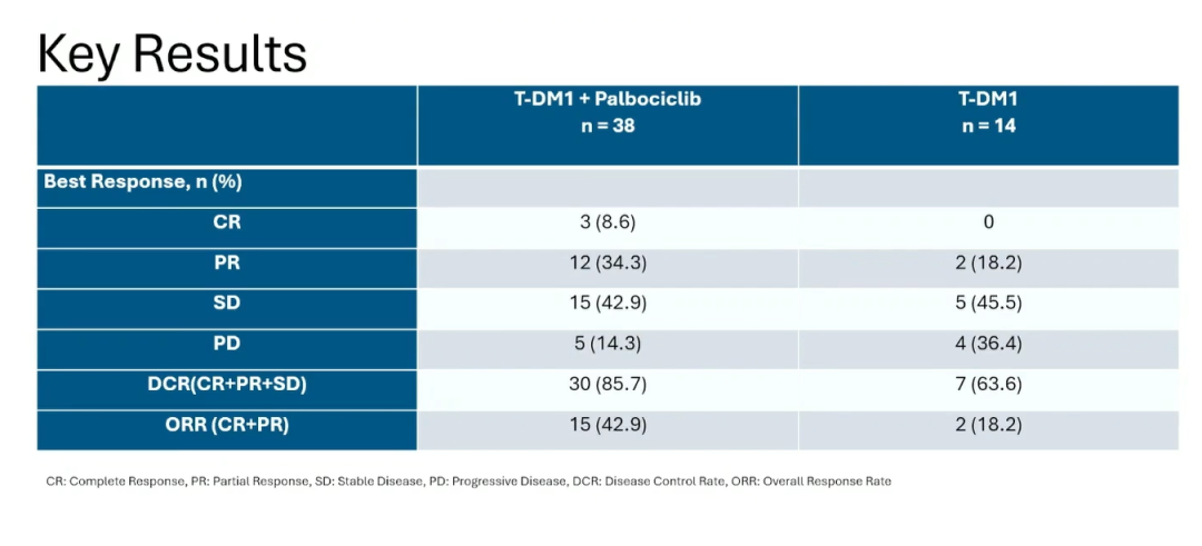 T-DM1单药组和T-DM1+哌柏西利组的中位PFS分别为8.3个月和16.9个月,其中雌激素受体阳性(ER+)亚型(中位PFS:16.9个月)和ER-亚型(中位PFS:17.1个月)的中位PFS相似。T-DM1单药组的ORR和疾病控制率[定义为完全缓解(CR)或部分缓解(PR)或疾病稳定≥6个月]分别为18.2%和63.6%,T-DM1+哌柏西利组的ORR和疾病控制率分别为42.9%和85.7%,联合组CR 3例,PR 12例。联合用药未发现新的不良事件,每种药物的不良事件符合预期。