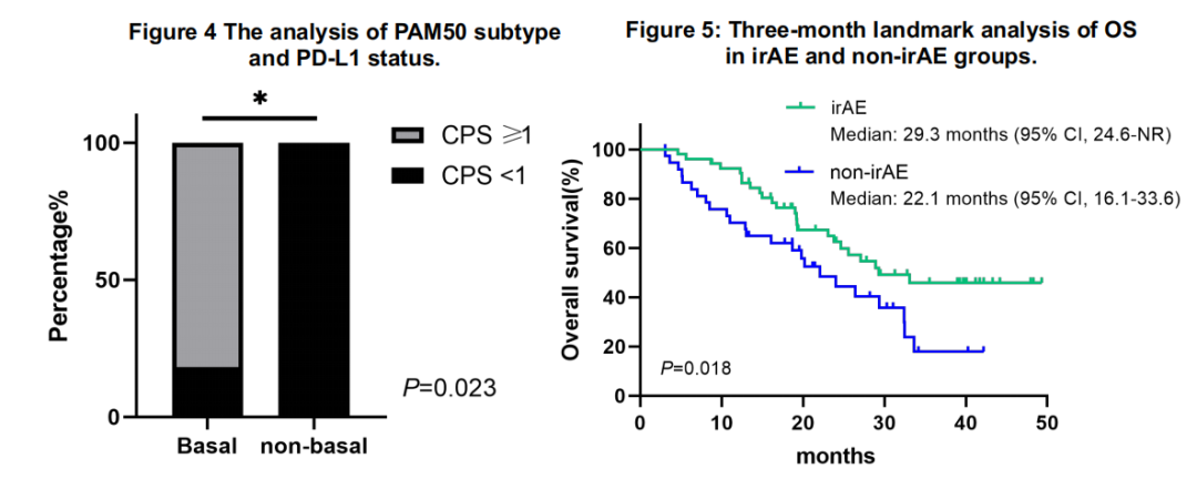 在基底样亚型中,PD-L1阳性(CPS≥1)的患者比例为81.8%,而在非基底样亚型中为0%(P=0.023)。三个月界碑分析显示,治疗期间发生irAE患者的中位OS明显长于无irAE患者(29.3个月vs.22.1个月,P=0.018)。