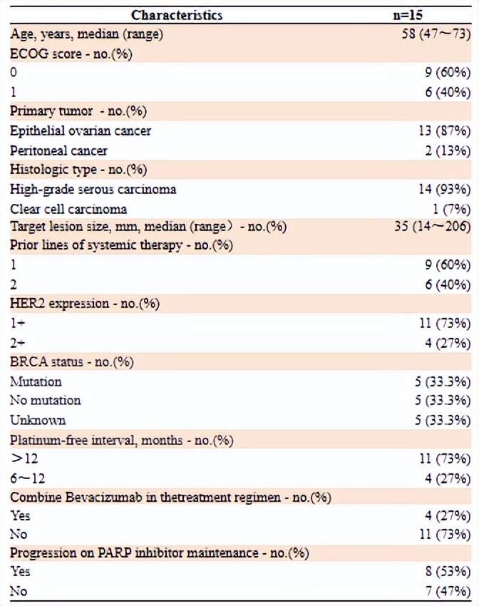 研究结果显示,截至2025年1月,纳入15例患者(中位年龄58岁),其中13例诊断为上皮性卵巢癌,2例为腹膜癌,93%为卵巢高级别浆液癌。此外,所有患者中,73%为HER2 IHC 1+,其余均为HER2 IHC 2+。中位既往治疗线数为1,中位随访时间3.2个月(范围:1~6.8个月)。其中4例患者接受“卡铂+维迪西妥单抗+贝伐珠单抗”治疗,11例接受“卡铂+维迪西妥单抗”治疗。