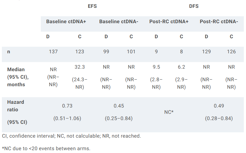 共1063例患者,其中包含462例生物标志物可评估人群(D组237例;C组225例)。患者特征与意向治疗(ITT)人群相似。总体而言,基线ctDNA阳性率为57%(260/460),新辅助治疗后RC前降至22%(94/422)。从基线到RC前的ctDNA清除率在D组为41%,C组为31%。RC前ctDNA阳性患者的非pCR率为97%(86/89)。RC后总体ctDNA阳性率为9%(31/345)。无论基线ctDNA阳性或阴性,D组较C组均显示EFS获益(见表);基于RC后ctDNA状态,围手术期D治疗在DFS方面也呈现类似获益趋势(见表)。