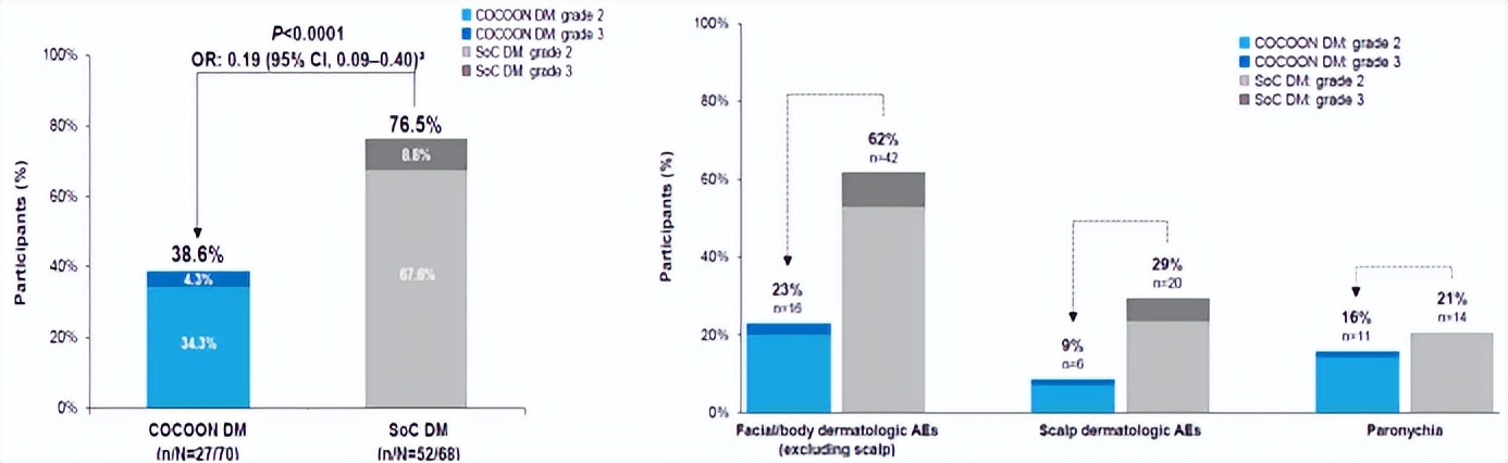 在2025年欧洲肺癌大会(ELCC)上,COCOON研究首次公布了主要终点数据,结果显示:皮肤加强管理方案可以显著降低埃万妥单抗联合兰泽替尼一线治疗前12周内出现的中重度(≥2级)皮肤相关不良事件(AE),由76.5%降至38.6%(OR:0.19;95%CI,0.09-0.40;P<0.001)。相较于标准皮肤管理,皮肤加强管理方案显著降低了包括面部/身体、头皮、甲沟炎在内的临床关注的中重度(≥2级)皮肤AE的发生率。