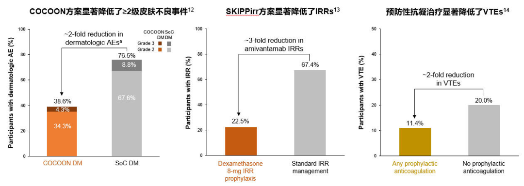 MARIPOSA方案不仅有令人瞩目的疗效数据,且安全性可管理,埃万妥单抗联合兰泽替尼组的中位治疗时间长达27个月,安全性与既往报道的一致,多为1-2级的EGFR和MET通路相关的不良事件,且可通过主动管理进行干预,预防性管理可以显著降低早期不良事件的发生[12,13,14](图7)。