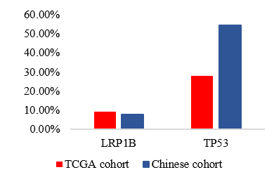 分析发现,TCGA cohort和Clinical cohort的LRP1B基因突变率分别为9.3%(35/377)和7.8(51/655)。TP53基因突变率分别为28.1% (106/377)和 54.5% (357/655)。中国患者人群中TP53突变比例相对更高。
