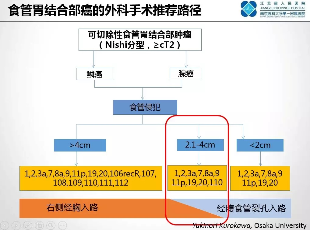 在第13届国际胃癌大会(IGCC)上,来自日本庆应大学医学院的北川教授报告了最新的日本胃癌协会和日本食管癌学会联合进行的关于研究食管胃结合部癌各组淋巴结转移率和治疗效果的前瞻性临床研究的结果,该研究纳入食管胃结合部癌(基于Nishi分型)363例,其中食管侵犯0~1 cm、1.1~2 cm、2.1~3cm、3.1~4cm、≥4 cm的癌,不论其分化类型,110组淋巴结转移率分别为0.9%、6.4%、10.8%、20.8%、28.6%,因此建议肿瘤侵犯食管<2 cm可不清扫纵膈淋巴结;侵犯食管2~4 cm需常规清扫110组淋巴结,推荐经腹食管裂孔入路;食管侵犯≥4 cm的癌中纵膈淋巴结转移率13.3%,推荐常规经右胸入路清扫中纵膈淋巴结(图1)。该研究中还发现直径>6 cm的食管胃结合癌患者的16a2组淋巴结转移率12.5%,建议清扫。对于食管胃结合部癌是否需要常规切脾以清扫第10组淋巴结,日本JCOG0110试验纳入505例未侵犯胃大弯cT2-4N0-2M0的胃上部癌患者,分为切脾组和不切脾组(不常规清扫第10组淋巴结)。结果表明:两组长期生存率无明显差异,脾切除组术后并发症发生率更高。因此,对于未侵犯胃大弯的胃上部癌患者,不建议进行预防性脾切除以清扫第10组淋巴结。日本胃癌学会和日本食管癌学会联合进行的食管胃结合部癌的回顾性调查结果显示:对于直径<4 cm的肿瘤,第4、5、6组淋巴结转移率极低。因此,笔者认为对于肿瘤<4 cm的Siewert Ⅱ型AEG,幽门上、下区域和大弯侧淋巴结的转移率很低,可不常规进行预防性清扫。