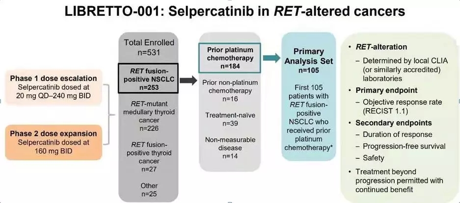 LIBRETTO-001研究是一项I/II期多队列临床试验(纳入携带RET融合的NSCLC和甲状腺癌患者及RET突变的甲状腺癌患者),研究分为I期剂量爬坡(20 mg 每日一次至240 mg,每日两次)和II期剂量扩展两个阶段,II期推荐治疗剂量设定为160 mg,口服,每日两次。其中肺癌队列入组253例患者,105例经治患者组成首要分析集(PAS集),另有34例为初治患者。研究的主要终点为ORR,次要终点包括反应持续时间、PFS及安全性(图1)。