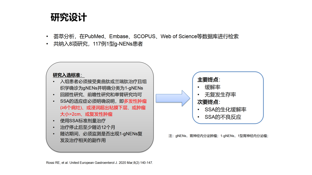 1型g-NENs是胃底/体部肠嗜铬样(ECL)细胞在升高的胃泌素刺激下不断增殖而形成的,而SSA在抑制胃泌素释放的同时还可以抑制ECL细胞增殖。因此,理论上,SSA可用于抑制1型g-NENs的发生、发展。然而,目前对于SSA在1型g-NENs中的疗效和治疗时机尚不明确。为此,来自意大利的学者开展了一项系统综述和荟萃分析,阐述了SSA治疗1型g-NENs的作用。
