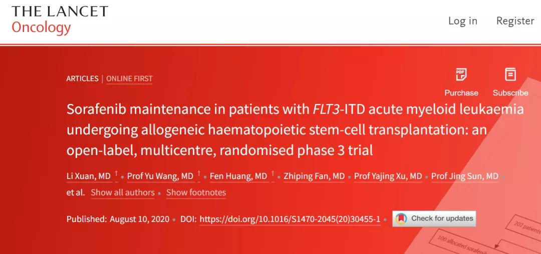 Xuan L, Wang Y, Huang F, et al. Sorafenib maintenance in patients with FLT3-ITD acute myeloid leukaemia undergoing allogeneic haematopoietic stem-cell transplantation: an open-label, multicentre, randomised phase 3 trial [published online ahead of print, 2020 Aug 10]. Lancet Oncol. 2020;S1470-2045(20)30455-1. doi:10.1016/S1470-2045(20)30455-1