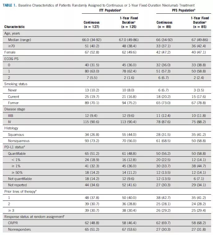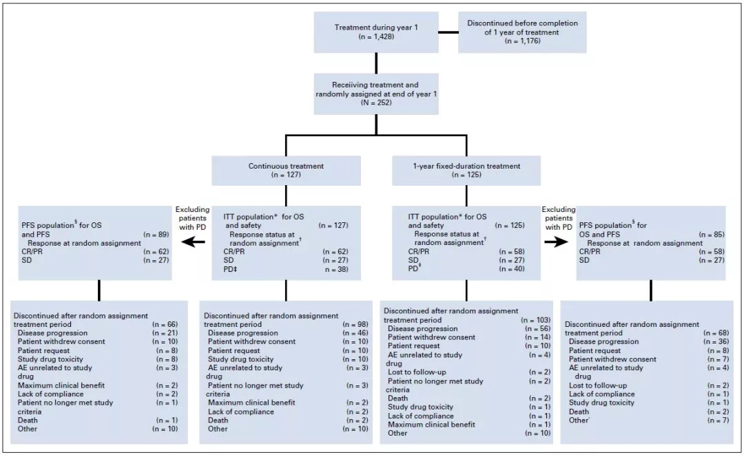 从2014年4月至2018年9月,共计1428例患者入组,252例患者接受1年Nivolumab治疗后随机分为两组:继续Nivolumab治疗组(A组)以及观察组(B组),两组分别入组127例和125例患者,并组成ITT分析人群。