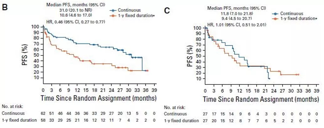 亚组分析显示,最佳疗效评估为CR或PR的患者,继续接受Nivolumab相较停止治疗组有更好的PFS,两组分别为31个月和10.6个月(HR=0.46);与此形成对比的是,最佳疗效评估为SD的患者,继续接受Nivolumab治疗和停止Nivolumab治疗的中位PFS无差异,两组分别为11.8个月和9.4个月(HR=1.01) (图3)。