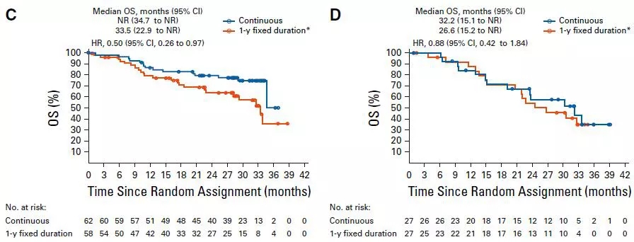 在PFS人群中,疗效评估为CR和PR的患者,继续接受Nivolumab治疗具有更好的OS获益,两组的中位OS分别为未达到和33.5个月(HR=0.50),而最佳疗效评估为SD的患者,继续接受Nivolumab治疗并未给患者带来OS的获益,两组OS分别为32.2个月和26.6个月(HR=0.88)(图5)。