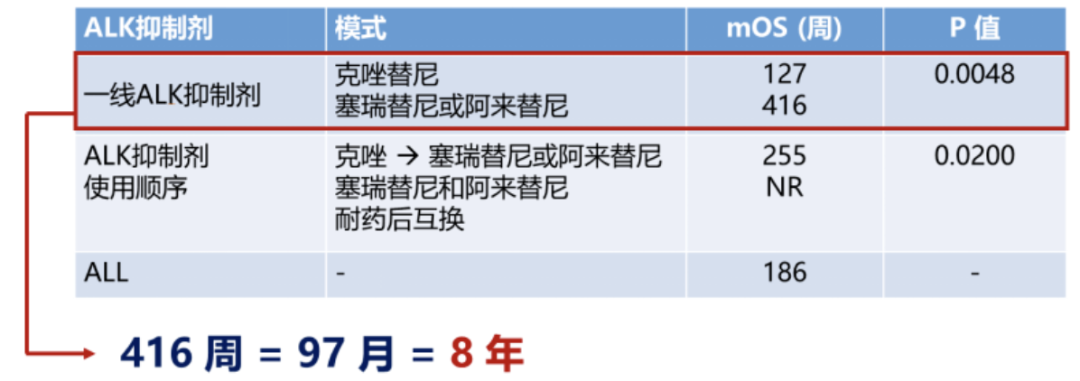 日本的真实世界研究结果表明,一线应用塞瑞替尼或阿来替尼可带来更长生存,OS达416周,二代药物进展后塞瑞替尼和阿来替尼互换使用仍有获益。而一线克唑替尼,PFS为127周,进展后序贯二代药物的PFS为255周。