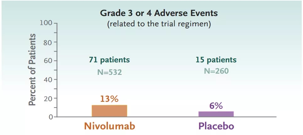 研究者评估的与活性药物或安慰剂相关的3级或4级不良事件发生率方面,纳武利尤单抗组为13%(532例患者中有71例),安慰剂组为6%(260例患者中有15例)(图2)。纳武利尤单抗组有9%的患者和安慰剂组有3%的患者因与活性药物或安慰剂相关的不良事件而中止试验方案。
