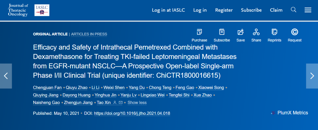 脑膜转移是灾难性的,患者往往会有明显的症状,但治疗效果较差,因此,患者预后极差,即使有靶向药物的加持,患者预后仍然不甚理想。近期,Journal of Thoracic Oncology [IF=13.357]杂志公布了老药新用——培美曲塞鞘内注射治疗脑膜转移的疗效及安全性,令人眼前一亮。