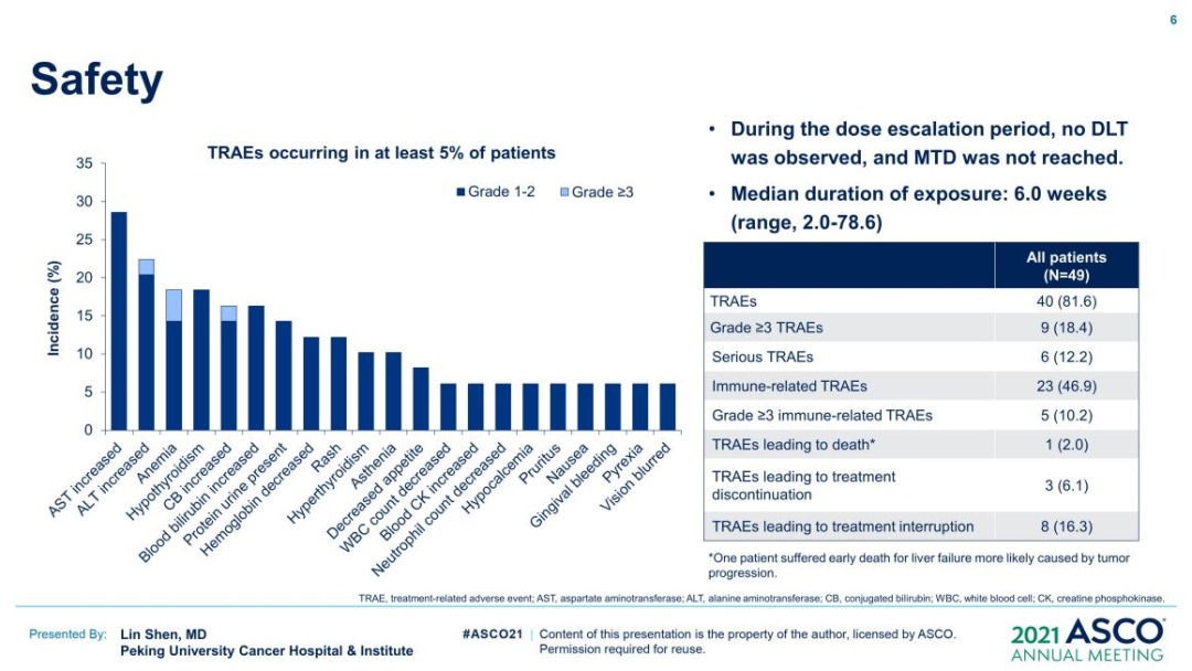 SHR-1701暴露的中位持续时间为6周(范围:2.0~78.6)。最常见的治疗相关不良事件(TRAEs)是ALT/AST升高、贫血、甲状腺功能减退和胆红素/结合胆红素升高,发生率>15%。研究者报告的irAEs发生率为46.9%,其中4例患者接受了全身糖皮质激素治疗。甲状腺功能减退和皮疹是最常见的irAEs,发病率>10%。≥3级TRAEs的发生率为18.4%。≥3级的irAEs发生率为10.2%。1例患者因肝衰竭早亡,更可能是肿瘤进展所致(图1)。