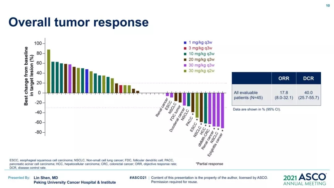 PK分析显示,SHR-1701在1~30 mg/kg剂量范围内与剂量暴露呈线性关系。在所有剂量组,外周血PD-L1靶区占位率均超过90%,几乎完全捕捉TGF-β1。49例患者中,有45例患者完成了至少一次疗效评估。ORR为17.8%(95%CI: 8.0%~32.1%)(图2),8例患者达到PR(2例肺腺癌,1例HCC,1例ESCC,1例dMMR-CRC,1例肾癌,1例会厌癌,1例胰腺腺泡细胞癌)。DCR为40.0%(18/45;95%CI:25.7%~55.7%)(图2)。大多数应答(7/8)仍在进行中,中位数DoR尚未达到。基于安全性、PK、PD和疗效数据,我们推荐30 mg/kg Q3W作为RP2D。