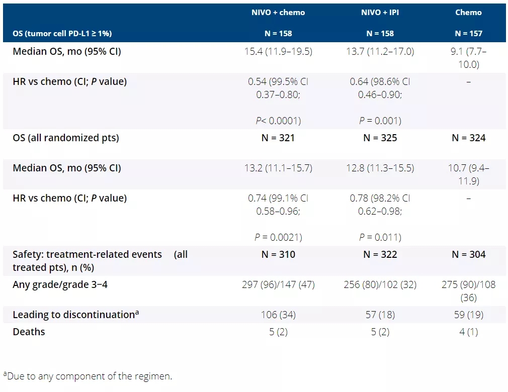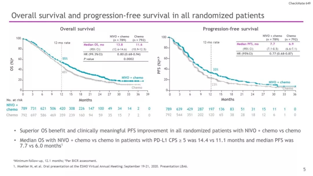 方法:符合条件的患者为先前未经治疗、不可切除的晚期或转移性GC/GEJC/EAC。已知的HER2阳性患者被排除在外。患者随机接受NIVO(360 mg Q3W或240 mg Q2W) +化疗(XELOX Q3W或FOLFOX Q2W)、NIVO +伊匹木单抗(IPI),或者化疗。在PD-L1 CPS≥5例患者中,NIVO +化疗对比化疗的双重主要终点为OS和PFS。分级检验的次要终点是PD-L1 CPS≥1和所有随机患者的OS。