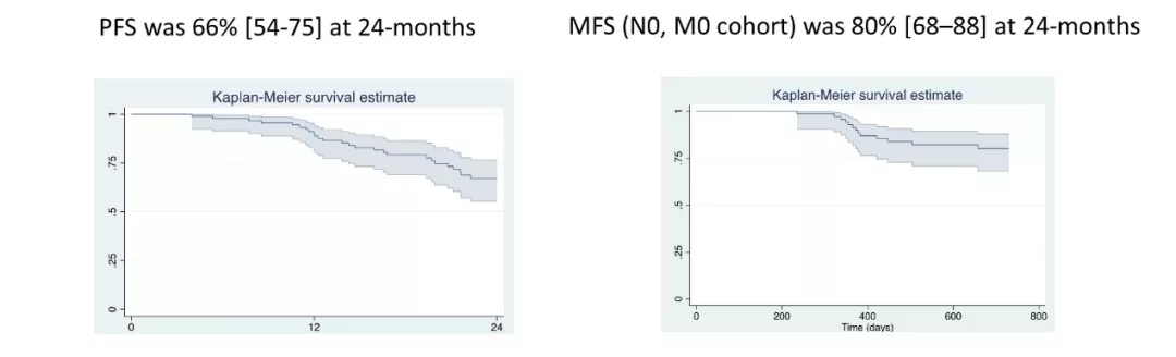 结果:在181例怀疑放疗后复发的患者中,通过再分期全身显像(胆碱能PET和骨扫描)显示局部病变128例(71%),淋巴结病变13例(7%),转移38例(21%)。MRI靶向活检的灵敏度为92%(95%CI:83%~97%)。特异性、阳性和阴性预测值分别为75%(95%CI:45%~92%)、94%(95%CI:86%~98%)和65%(95% CI:38%~86%)。单纯TTPM活检漏诊4/72(6%),单纯MRI靶向活检漏诊6/72(8%)。以Likert评分4-5表示影像学阳性,mpMRI的总灵敏度为81%(95%CI:73%~88%)。特异性、阳性和阴性预测值分别为88%(95%CI:73%~98%)、96%(95%CI:90%~99%)和57%(95%CI:42%~70%)。93例接受局部消融的患者中,78例(84%)保留了尿控功能;5/93(5%)出现CTCAE 3级以上不良事件。无直肠损伤。中位随访27.8个月[SD 1.3]时,24个月的PFS率为66%[54~75]。73例局限性前列腺癌患者中,24个月时无转移生存率(MFS)为80%[95%CI:68~88],详见图2。未出现癌症特异性死亡。