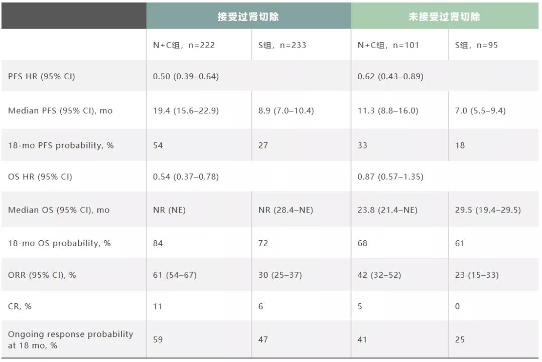 总体上,与未接受过肾切除术患者相比,接受过肾切除术患者的低肿瘤负荷、有利IMDC风险的比例更高,并且应用N+C或S治疗得到了更大的疗效获益(PFS:19.4 vs 11.3个月;OS:NR vs 23.8个月)。无论肾切除术状态如何,与S相比,N+C治疗均可改善患者的PFS、ORR、完全缓解和持久性缓解。