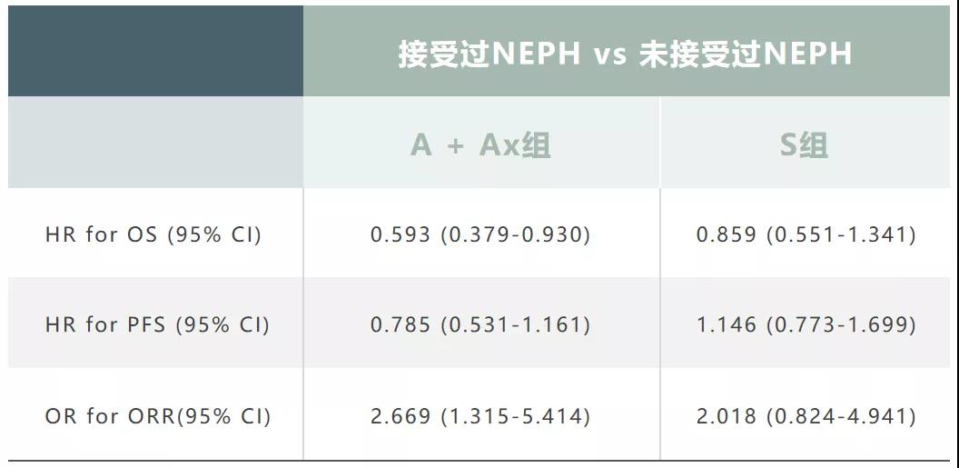 调整上述因素后,在A+Ax组中,与未接受过NEPH患者相比,接受过NEPH患者的OS和ORR改善更显著;然而,在S组中未观察到任何差异。在A+Ax组中,接受过NEPH患者的PFS在数值上比未接受过NEPH的患者更长,但在S组中没有差异。