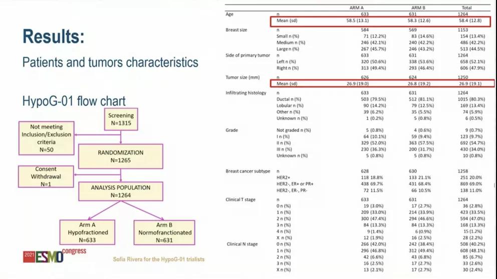从2016年9日至2020年3月,法国29个地区招募了1265名女性,其中HF-RT组:633名,NF-RT组:632名。所有患者(中位年龄:58岁)接受并完成了他们预定的放射治疗并结束随访。急性3级毒性在两个治疗组中均很罕见(HF-RT5.4%,NF-RT5.7%),且未观察到4-5级毒性。