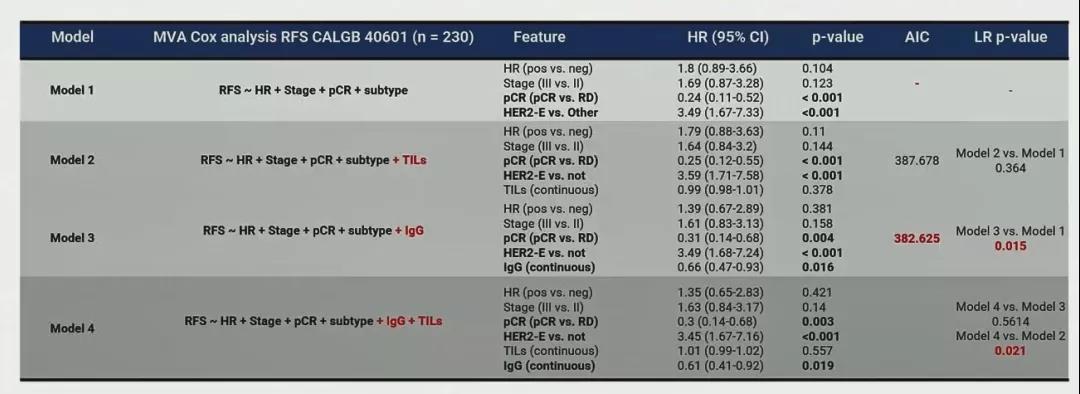 该研究对CALGB 40601试验中的230例样本,PAMELA试验139例样本进行210个基因序列的免疫基因表达特征及肿瘤浸润肿瘤细胞的检测,并作为连续变量进行评估。其与pCR和RFS的相关性应用回归分析及COX模型进行分析,对2种模型的拟合优度比较使用了AIC标准,为了比较2个嵌套模型的预后价值使用了似然比测试。
