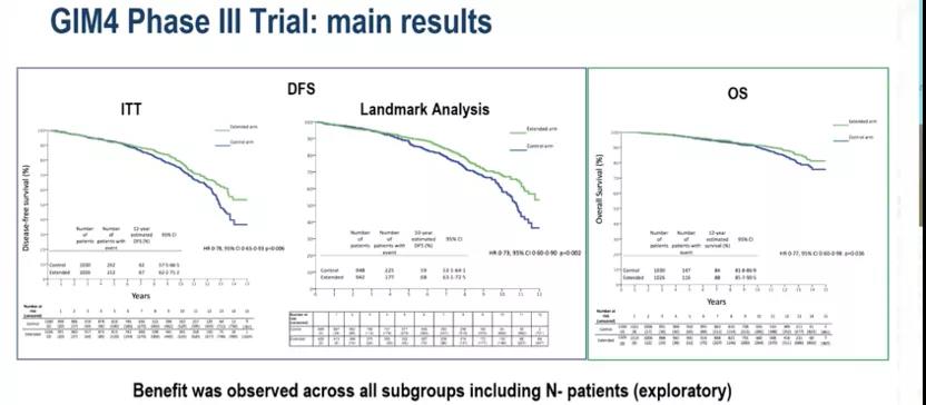 GIM研究将完成2~3年辅助TAM治疗的绝经后HR阳性早期乳腺癌患者1:1随机分配,分别接受5年和2~3年来曲唑治疗。该研究共入组2056例患者,主要研究终点为DFS,次要研究终点为总生存率和不良反应。研究结果显示,2~3年他莫昔芬治疗后,序贯来曲唑5年较来曲唑2~3年可降低22%的DFS事件(HR 0.78,0.65~0.93;p=0.006)。该研究结果提示,存在乳腺癌复发风险的患者可考虑使用2~3年他莫昔芬序贯5年AI的治疗方案。