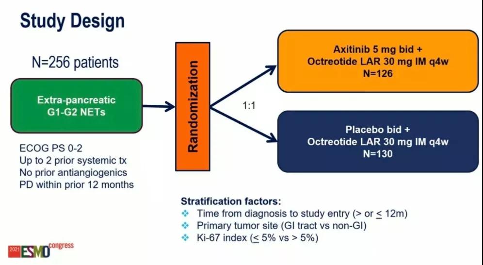 共入组256例患者,阿昔替尼组和安慰剂组分别有126例和130例(G1-2:29%-71%)。最常见的原发肿瘤部位是SI(47%)、肺(28%)、直肠(6%)、UK(8%)、胃(3%)和结肠(2%)。既往治疗包括SSA(48%)、依维莫司(13%)、化疗(13%)、局部放疗(7%)和PRRT(3%)。