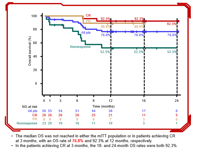 无论是mITT人群还是在3个月时获得CR的人群,中位OS均未达到,12个月OS率分别为76.8%和92.3%。