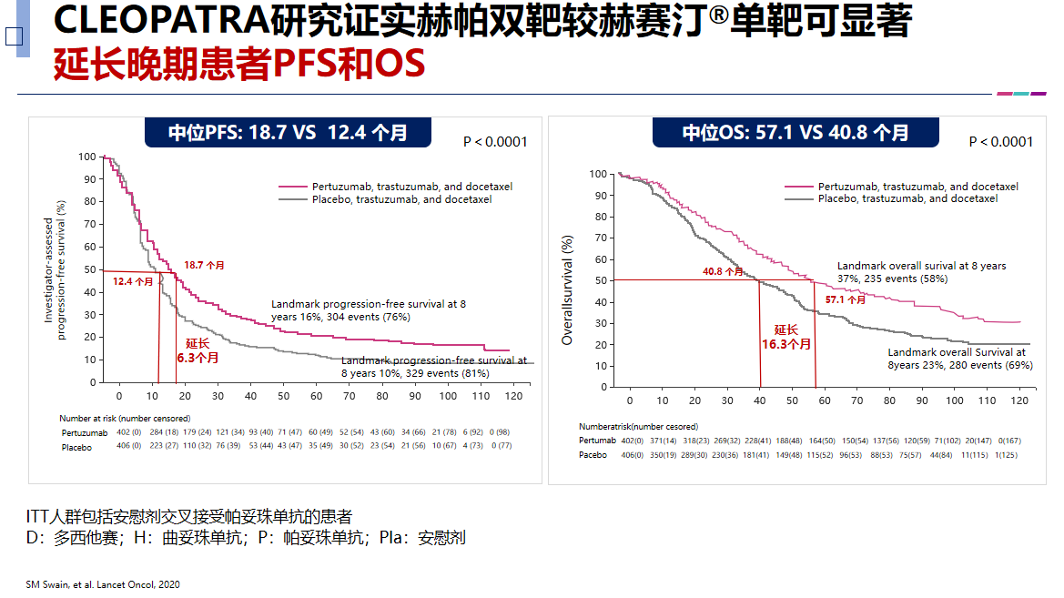 另一项单臂的PERUSE研究则进一步证实,曲帕双靶联合不同紫杉类(白紫、多西他赛、紫杉醇)的一线治疗,PFS和OS分别达到20.7个月和65.3个月,尤其是既往未接受曲妥珠单抗(新)辅助治疗的患者OS达到了73.5个月。该研究进一步验证了CLEOPATRA研究的结果。这些研究均表明,HER2阳性乳腺癌患者曲帕双靶一线治疗可使部分患者实现5年长期生存。