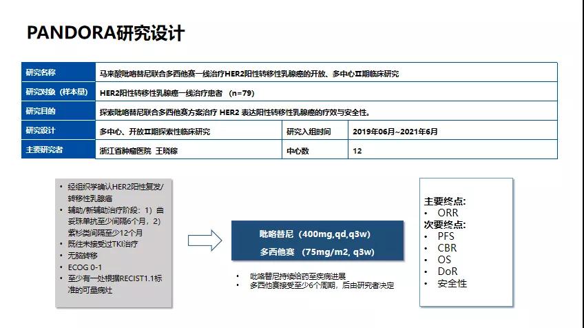 因此,探索吡咯替尼联合多西他赛一线治疗早期新辅助或辅助曲妥珠单抗经治的人群具有重要意义和探索价值。由中国科学院大学附属肿瘤医院王晓稼教授牵头的多中心,单臂Ⅱ期PANDORA研究,旨在探索吡咯替尼联合多西他赛一线治疗HER2阳性晚期乳腺癌的疗效与安全性。