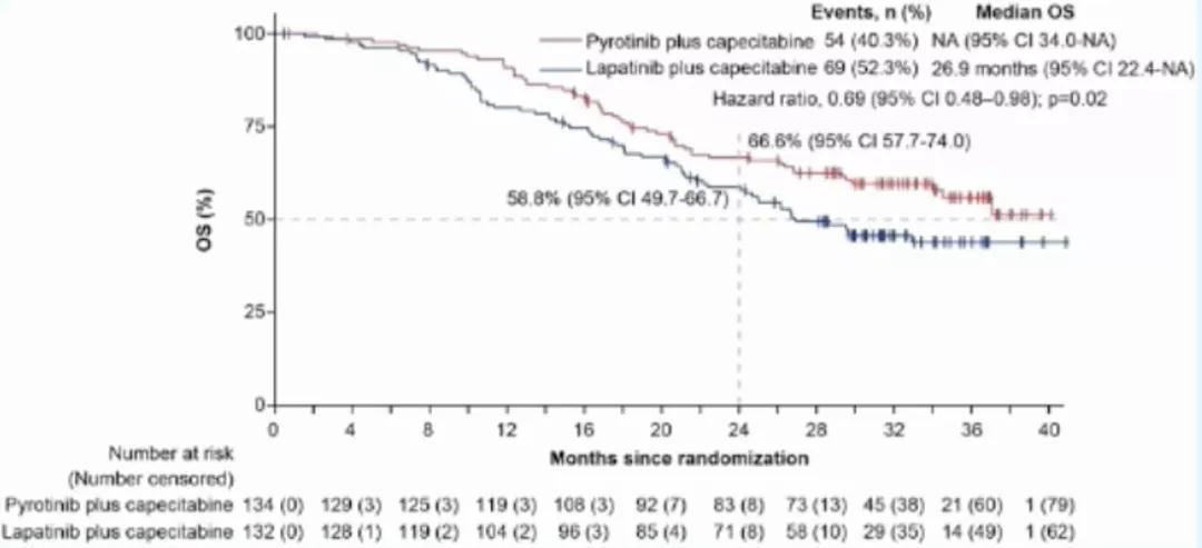 吡咯替尼是一种不可逆、泛-ErbB受体(HER1、HER2和HER4)的酪氨酸激酶抑制剂,入组患者按照1:1比例随机分为吡咯替尼或拉帕替尼联合卡培他滨,根据HR状态和既往治疗线序等进行分层。主要研究终点是独立中心评估的PFS。此次OS更新数据截止日期为2021年3月31日。