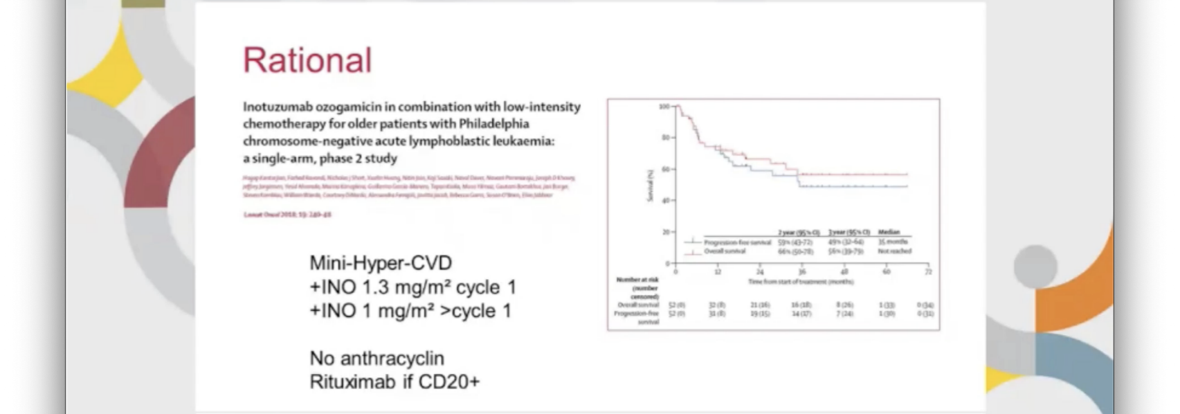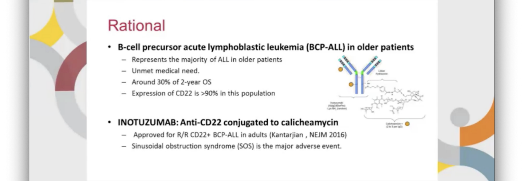这是一项来自欧洲成人急淋工作组的单臂、前瞻性、多中心临床试验(大会摘要号:511),主要针对初诊的老年B-ALL、Ph阴性且表达CD22的白血病细胞,采用联合CD22单抗(Inotuzumab ozogamicin, Ino)治疗来观察它的疗效和安全性。