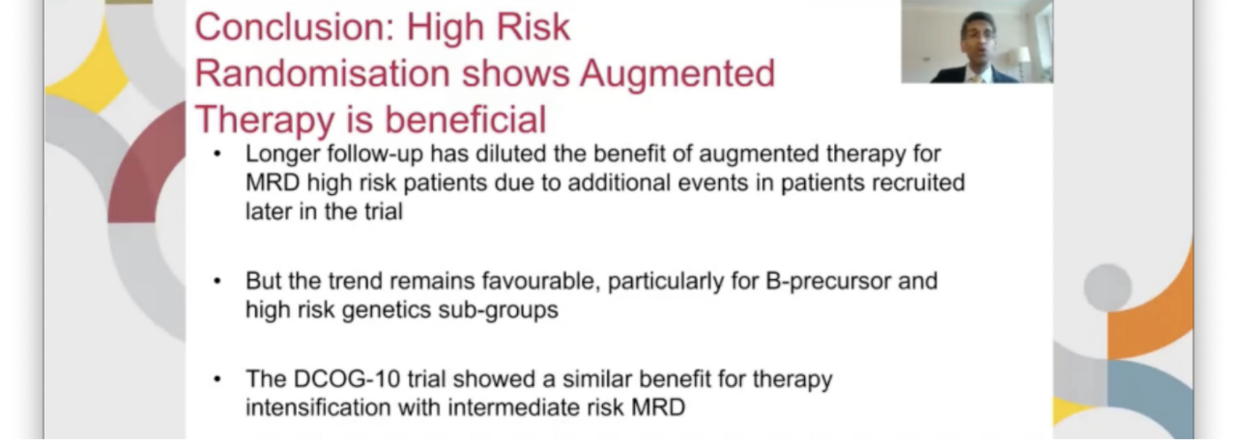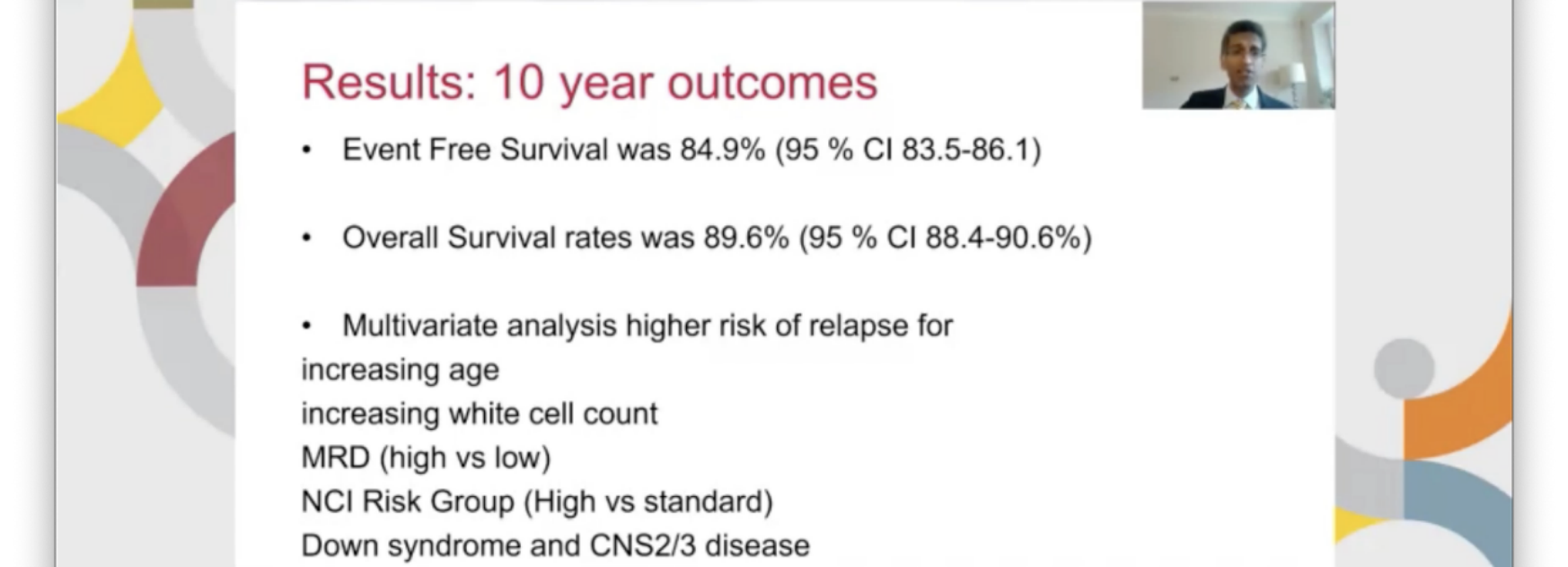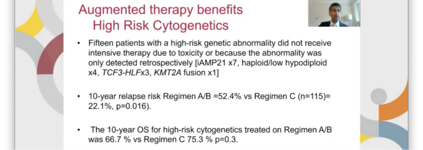 共有3113例患者纳入分析,结果表明,中位随访时间9.4年,10年的复发率是10.7%,无事件生存率是84.8%,总生存89.6%。对于MRD低危的患者,把强化治疗从标准的2个疗程减为1个疗程后,可以看到实际的疗效并没有受到影响。对于MRD高危的患者,特别是具有高危染色体异常的患者,采用加强治疗方案后,患者的疗效有所提高。
