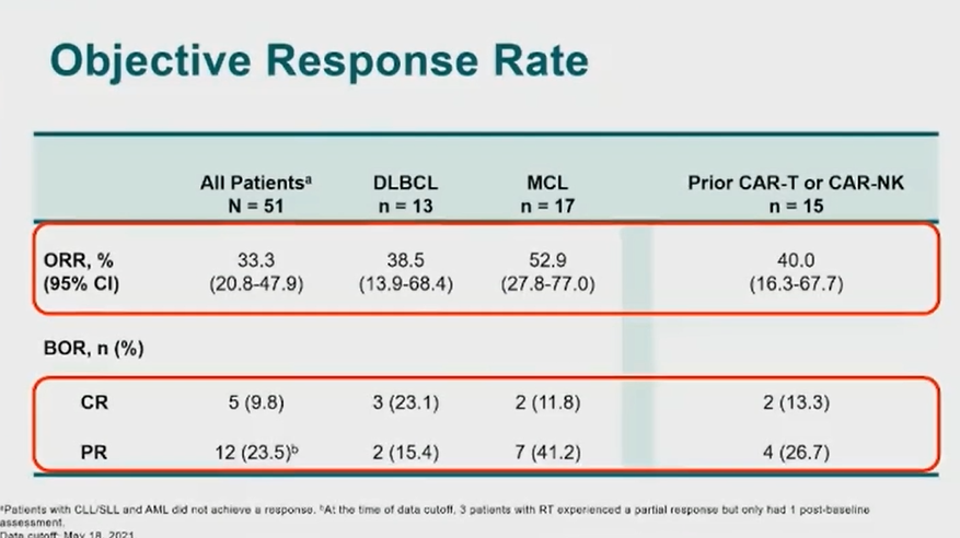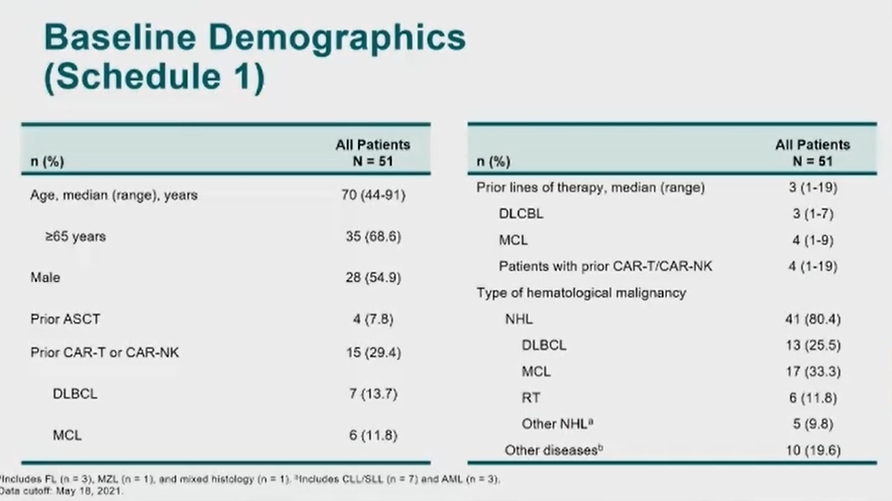 研究总共入组了51例难治复发弥漫大B细胞淋巴瘤或套细胞淋巴瘤患者,约30%的患者既往接受了CAR-T或CAR-NK的治疗,多数患者接受了多线治疗(中位线数:3线)。中位随访时间是17.3个月。