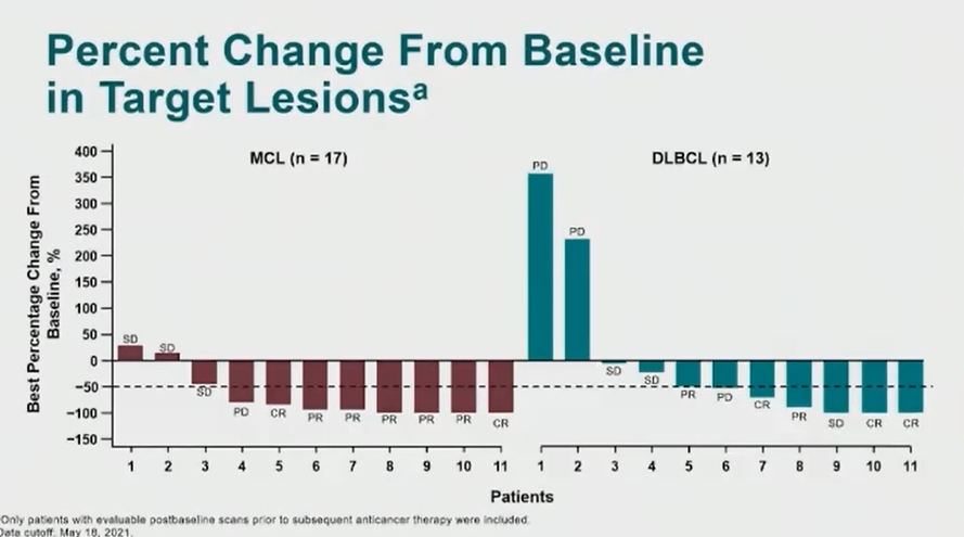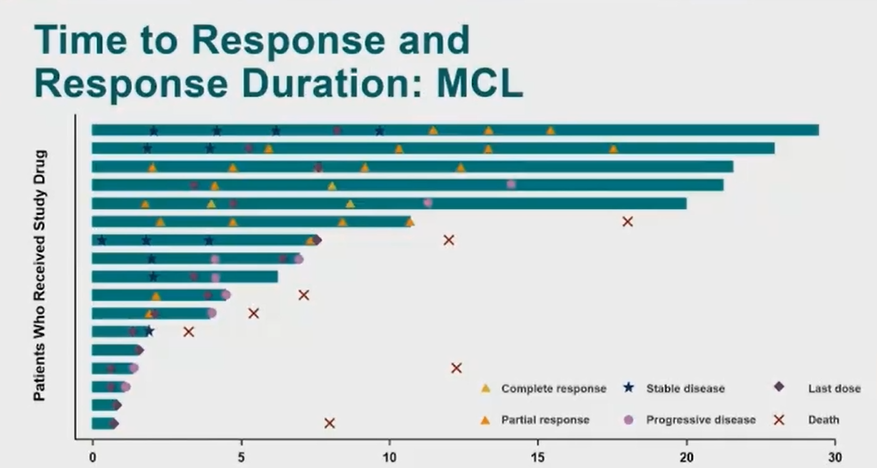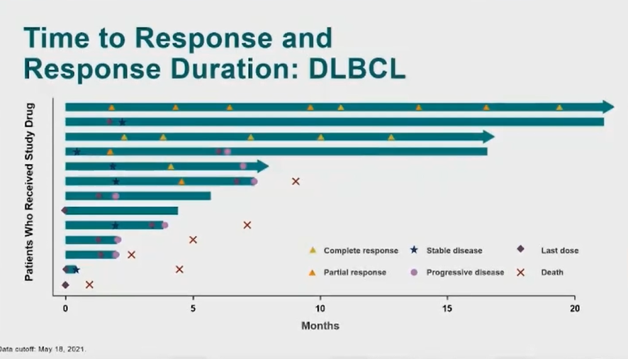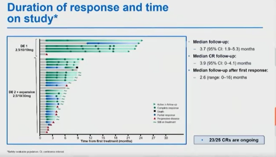 主要研究终点为整体缓解率。值得关注的是,有15例既往接受了CAR-T或CAR-NK治疗的患者,仍然有40%获得了肿瘤的应答。这表明既往接受细胞治疗对于该药的疗效不会产生明显的影响。总体上,大部分患者获得缓解后的中位缓解期非常长,有些甚至已经超过了一年。这也显示出该药具有持续的抗肿瘤价值。从整个缓解期来讲,在套细胞淋巴瘤患者的中位DOR达到10个月,弥漫大B细胞淋巴瘤患者达到4.6个月。