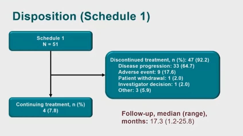 研究最终纳入100例患者,从患者的基线特征可以看出,多数既往接受了多线标准治疗,整体来说是标准的复发难治人群。结果显示,无论是每3周还是每周方案都显示了比较好的治疗顺应性。同时,从安全性的角度来说,主要的毒副反应为骨髓抑制,它的总体发生率是可控的,也没有严重的导致治疗相关性的死亡事件。