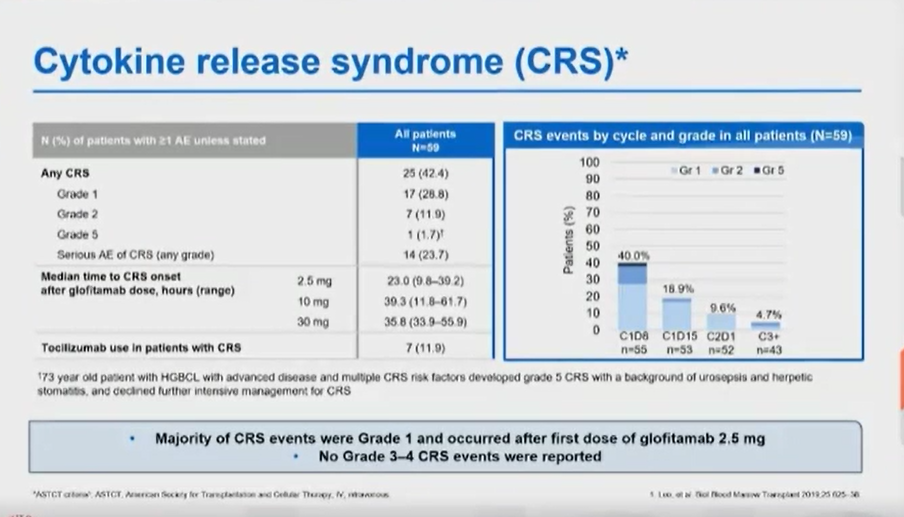 从整体的安全性来讲,91%的患者获得了不同程度的毒副反应,但3~4级的AE(不良事件)的发生率为57%,总体来讲这个组合还是非常安全的。另外45%的患者发生了不同程度的严重不良事件(SAE),主要是来自于这个双抗所产生的,大概42%的患者发生了细胞因子释放综合征(CRS),但绝大部分都是1级和2级的反应。其他反应包括神经毒性以及外周神经病变,肿瘤快速进展发生率都是相对比较低,而且是可控的。