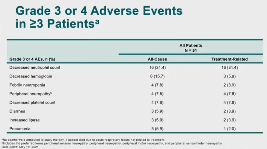 对于安全性角度来讲,大概64%的患者获得了3级或者4级的不良事件,治疗相关的不良事件的比例在3,4级来讲大概是47%,没有治疗相关的死亡AE事件的发生。从毒性分布图上看最常见的毒副反应主要是外周神经病变,包括疲劳及消化道反应,我们非常关注3,4级的AE,大概有30%的患者获得了中性粒细胞的缺乏,其他的3,4级的毒副反应的发生率都不超过10%。对我们特别需要关注的不良事件,最主要的还是在外周神经病变和骨髓抑制,特别是中性粒细胞的缺乏。大概只有不到10%的患者因为各种AE导致了治疗中断。
