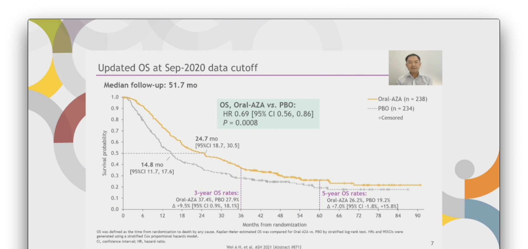 该项研究经过1年以上的额外生存期随访,结果表明持续的,采用口服阿扎胞苷的维持治疗对于AML患者加强化疗获首次缓解后的长期生存具有显著获益。