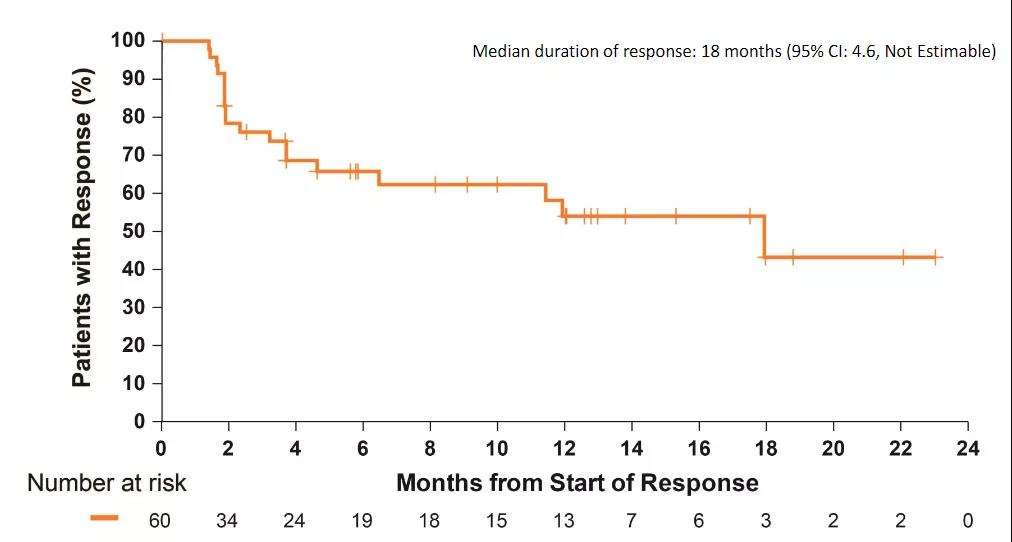 截至数据截止日期,60%缓解的患者仍在接受治疗,其中位缓解持续时间为18个月(95%CI:4.6~不可估计)。
