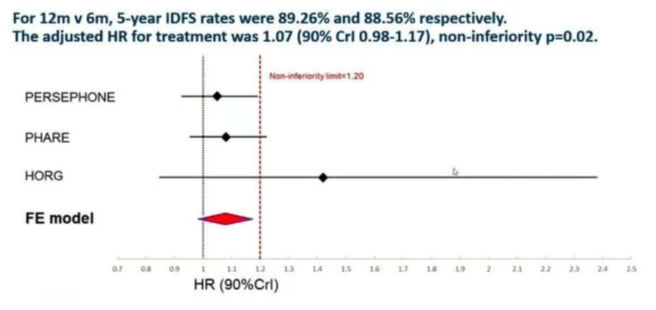 2021年ESMO大会报道了一项荟萃分析,纳入了5项短疗程非劣效性随机对照试验,包括对比6个月和标准12个月疗程的PERSEPHONE、PHARE、HORG研究,对比9周和12个月疗程的SOLD、Short-HER研究。该荟萃分析结果显示,12个月疗程及短疗程(包括9周或6个月)曲妥珠单抗辅助治疗患者的5年iDFS率分别为88.46%和86.87%,并未达到显著性非劣效(HR 1.14,95%CI:0.88~1.47;非劣效性P=0.37);但是12个月和6个月疗程的非劣效性有显著意义,5年iDFS率分别为89.26%和88.56%(HR 1.07,90%CI:0.98~1.17;非劣效性P=0.02);而12个月和9周疗程的没有达到非劣效性,5年iDFS率分别为91.40%和89.22%(HR 1.27,90%CI:1.07~1.49;非劣效性P=0.56)。