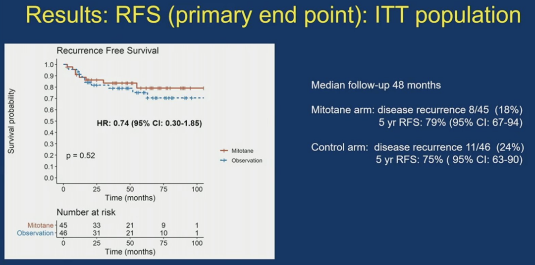 ADIUVO研究入组了91例I-III期ACC、R0手术和Ki-67≤10%的患者,按1:1比例随机分配至米托坦组(MTI,n=45)和观察组(OBS,n=46),主要终点为RFS。