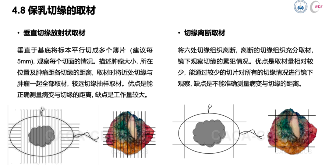 切取切缘的方法此次指南只推荐了两种方式:垂直切缘放射性取材和切缘离断取材;抛弃了国内很多医院经常采用的残腔多点取材的方法。从精准外科发展的理念来看,残腔多点取材方法确实存在切缘取材不准、容易遗漏等缺点,尤其这种切缘取材的精准性和临床医生的经验有很大的关系,对于基层医院或者保乳经验少的医生这样的切缘取材方式存在很大的医疗隐患。