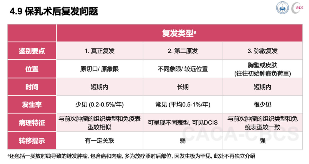 保乳术后复发类型的判定及处理一直都存在争议。此次指南根据复发的位置、时间、发生率、病理特征及与转移的关系等因素详细的阐述了保乳术后真性复发、第二原发癌及弥散复发如何进行鉴别,对于复发时间短的真性复发及弥散复发,要评估全身情况再决定局部处理的方式及时机。如果再次保乳应该选择单病灶小于2cm、无复发间期长(>4年)、生物学相对惰性(ER+)的患者,同时要严格控制术后切缘,切缘的方式更适合垂直切缘放射性取材。关于二次前哨淋巴结活检在指南中虽然提出来,但是只是作为可选,检出率及准确性都会降低。如果要开展二次前哨淋巴结活检,得需要MDT会诊及在有双标法的单位才能实行。