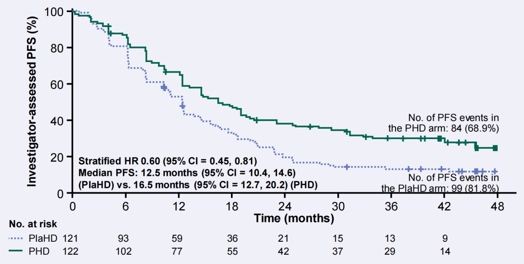 方法:将未经治疗的HER2阳性LR/MBC患者按1:1(按内脏疾病和激素受体状态分层)随机分为PHD组或安慰剂组(Pla+HD)。主要终点是研究者评估的PFS。次要终点包括安全性和OS。初步分析后,允许患者从安慰剂组交叉至PHD组。