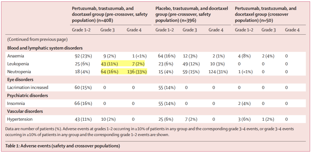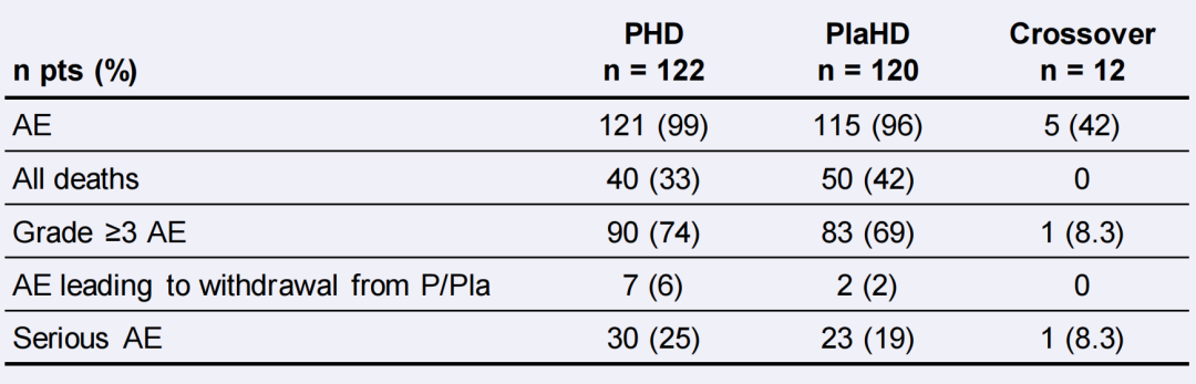 安全性方面,PHD组和安慰剂组≥3级AE发生率分别为74%和69%,严重AE发生率分别为25%和19%。PHD组常见的≥3级AE为中性粒细胞减少(58%)、白细胞减少(49%)、粒细胞减少性发热(4%)、高血压(4%)、贫血(5%)、腹泻(4%)、肺炎(3%)等。双靶组中有2例患者发生射血分数降低,但没有发生心衰、症状性左室收缩功能障碍或左室射血分数下降至<40%。
