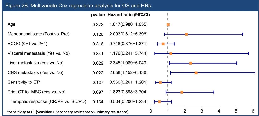 中枢神经系统(CNS)转移是OS的独立危险因素(HR=2.658, [95%CI, 1.152-6.136], p=0.022);