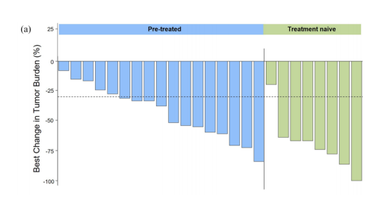 △图2.PAS(a)和所有NSCLC患者(b)的肿瘤负荷最大变化瀑布图:瀑布图为IRC评估PAS(n=26)和所有NSCLC患者(n=47)所有靶病变的肿瘤负荷最大变化;瀑布图仅显示具有可测量靶病变的患者;在PAS和所有NSCLC中,分别有1和2例患者无可测量病灶。