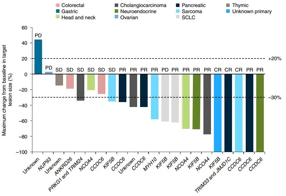 普拉替尼治疗的客观缓解率(ORR)为57%(95%CI:35–77),这意味着超过一半的患者在接受治疗后病灶显著缩小了30%以上。1位胰腺癌患者、1位胆管癌患者和1位肉瘤患者被确认为完全缓解(CR),肿瘤完全消失。
